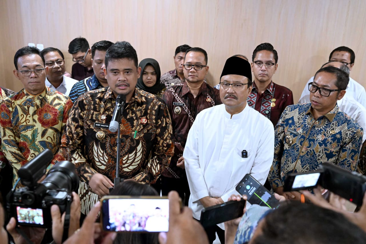 Gubernur Sumut, Bobby Afif Nasution memberi penjelasan usai menghadiri Dialog Pilar-Pilar Sosial dan Koordinasi Sosialisasi dengan Kepala Daerah se Sumatera Utara bersama Menteri Sosial Republik Indonesia Saifullah Yusuf di Aula Raja Inal Siregar Lantai 2 Kantor Gubernur Sumut, Jalan Diponegoro 30 Medan, Jum’at (11/4/2025).