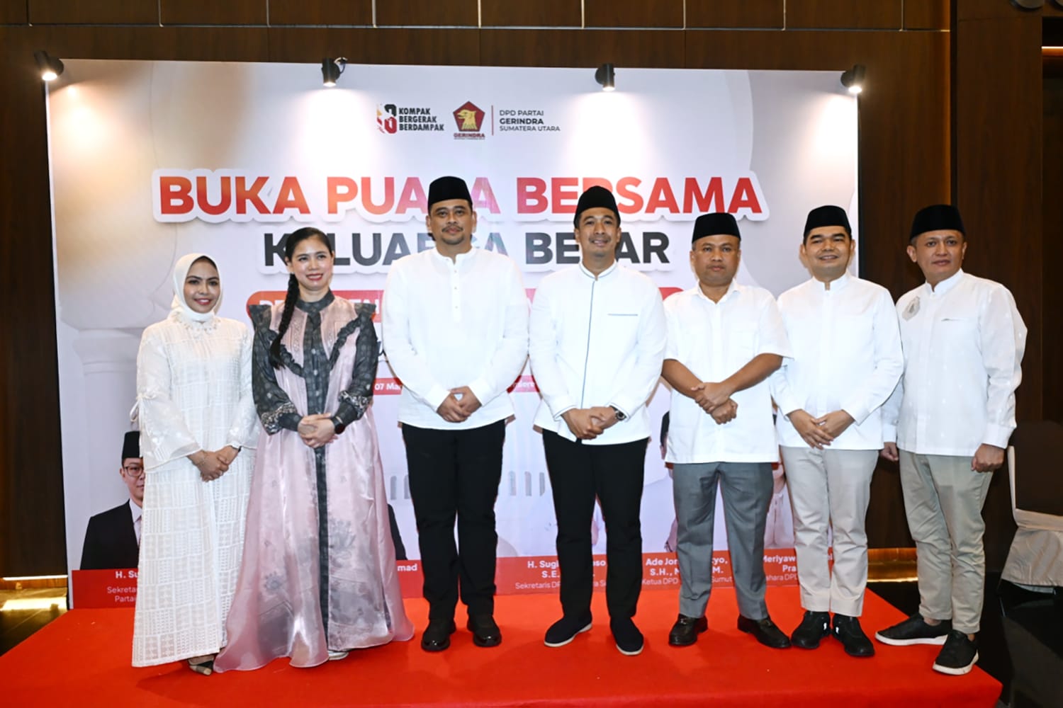 Gubernur Sumatera Utara M. Bobby Afif Nasution foto bersama di sela buka puasa bersama Partai Gerindra Sumut dI Convention Hotel Santika Dyandra Jalan Kapten Maulana Lubis Medan, Sabtu (7/3/2026). Acara dihadiri oleh para petinggi Partai Gerindra Sumut, Ketua DPRD Sumut, serta Bupati/Wali Kota Se-Sumut.