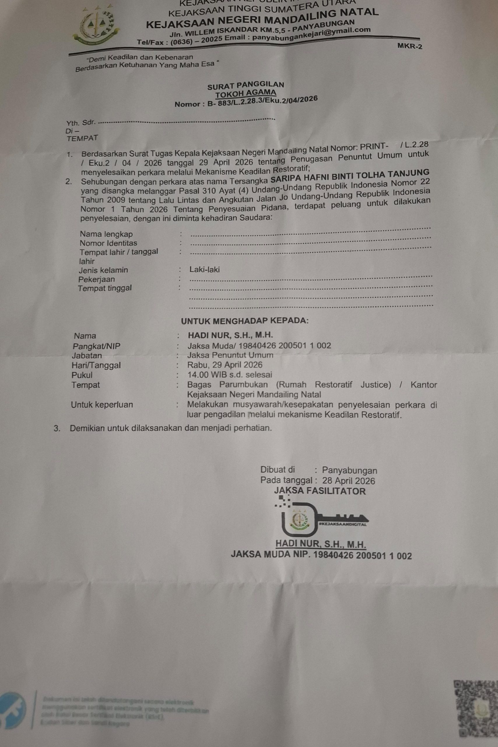 Abdul Azizul Hakim Siregar,anak korban Khoiriah Harahap yang meninggal dunia pada kecelakaan lalu lintas (laka pantas) yang terjadi pada 29 Oktober 2025 di depan Puskesmas Sihepeng kecamatan Siabu Kabupaten Mandailing Natal (Madina) mempertanyakan apa kepentingan Kasipidum Kejari Madina dalam kasus tersebut.